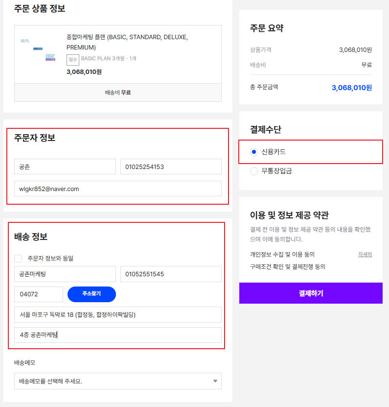▲결제창 정보 기입