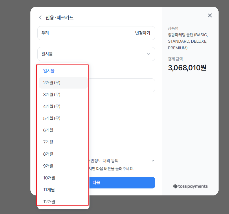 ▲결제창 활성화 되면 할부 개월수 선택 후